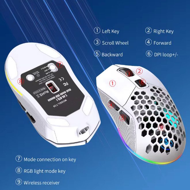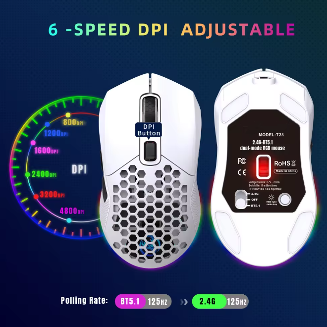 Feature: Two-mode connection, 6 Speed DPI adjustable, Dual mode.
