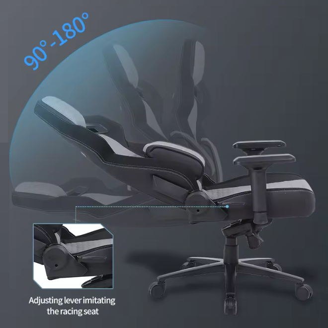 Feature: Soft pillow, Adjustable arm can be up anddown, Arm pad also can be rotable, also the recliner helpd the chair 155 degree recling available. Strong star base and wear-resistant wheels.